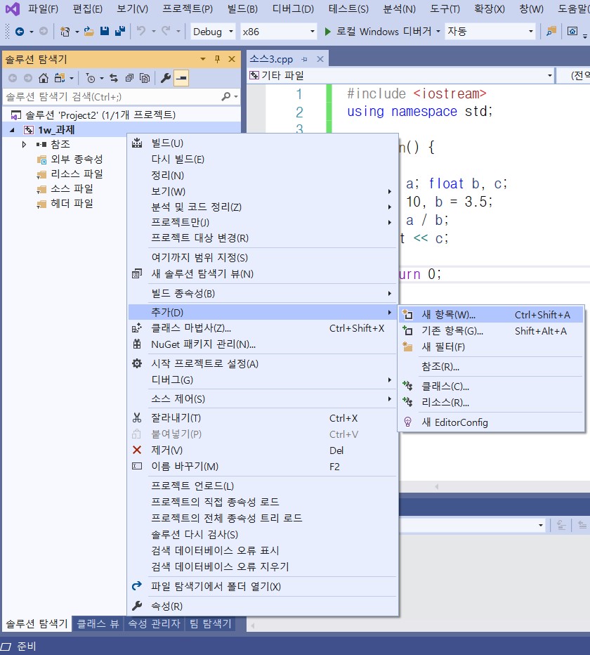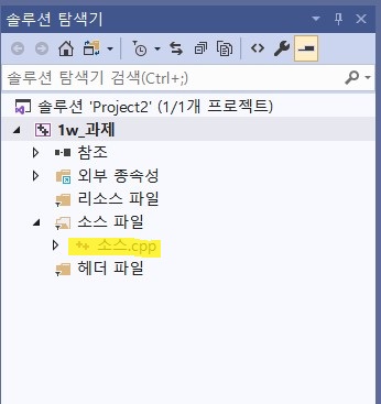 오른쪽 클릭 > 추가 > 새 항목 눌러서 .cpp 파일 열어야해요